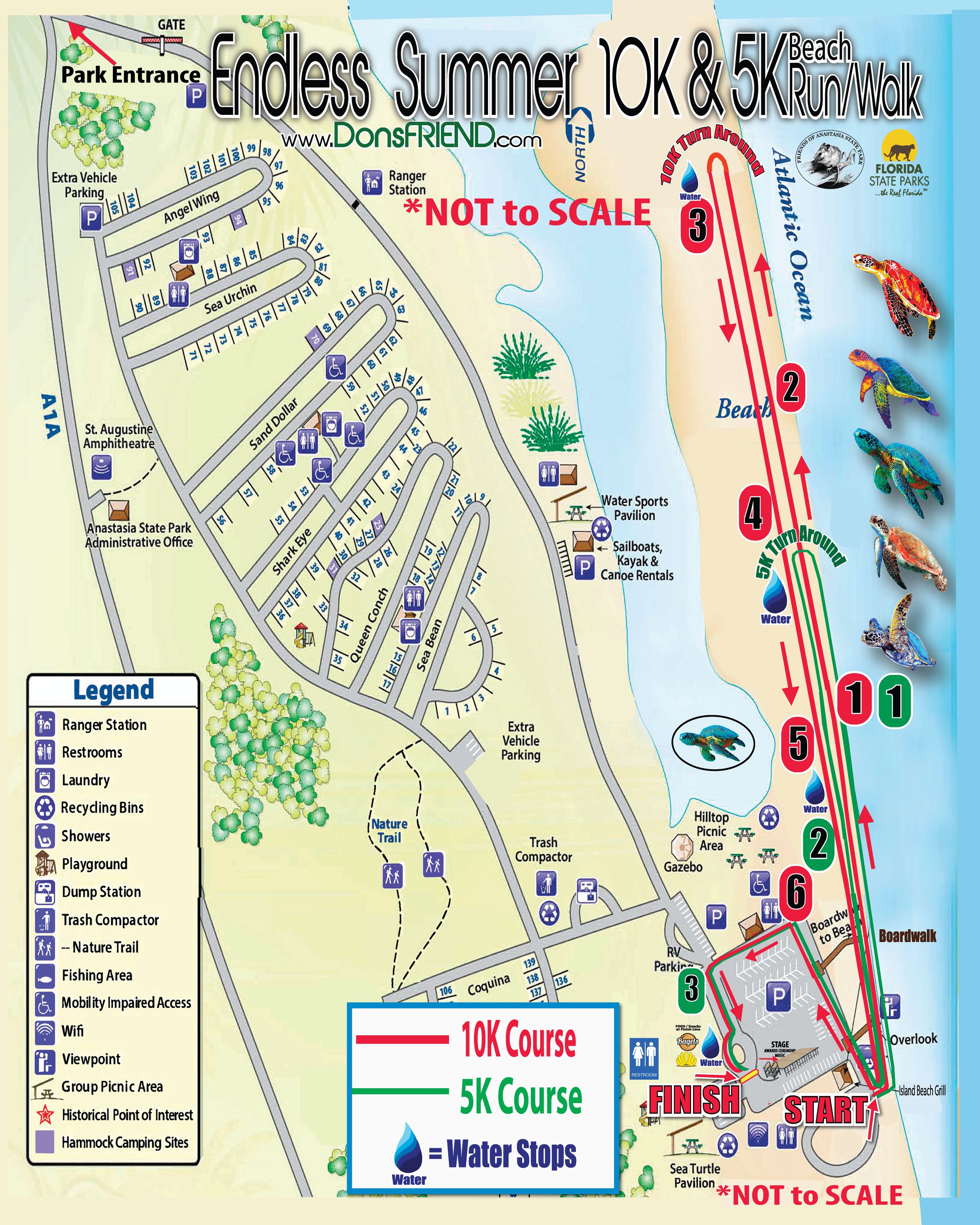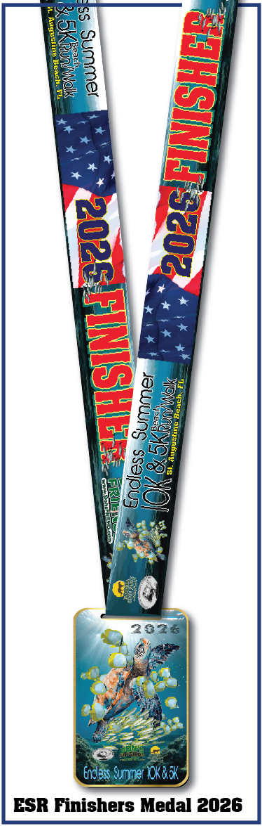 2026 will be our 23rd Annual Endless Summer 10K and 5K Beach Run/Walk. Both the 10K and 5K have SOLD OUT 12 years in a row! These 2 Great Runs are presented by Don's Friends and benefit 2 Great Charities...Don's FRIENDS and Friends of Anastasia. The Event is hosted by Anastasia State Park, which is a BEAUTIFUL Ocean Front State Park located in St. Augustine, Florida.....Over 4 Miles of PRISTINE Ocean Front Beach. Ocean Front, Anastasia State Park is an active Sea Turtle breading ground. Our very popular graphics for the Endless Summer Runs feature a New Sea Turtle graphic each year. Our Turtle Shirts are Very Popular. Each runner will receive a Performance Tech T-shirt featuring our full-color Turtle graphic. Runners also receive a beautiful bag (value $30.00), a Finishers Medal and other goodies. This year is our BEST EVER !! See our RUN INFO Page for Info on our 10K , 5K and our Virtual Run options.